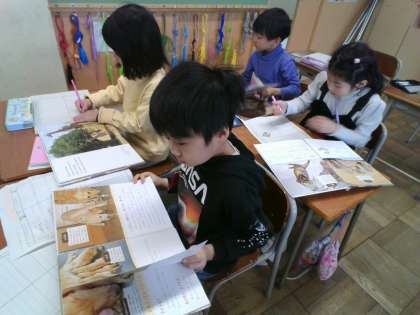 国語科「どうぶつの赤ちゃん」の学習を終え、さらに知りたい調べたい動物の赤ちゃんについて、子供たちが各々調べています。本の中から必要な情報を探し出す練習にもなっています。