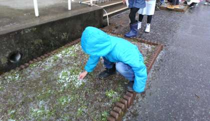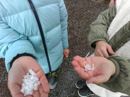 掃除が終わる頃、空から大粒のあられが降ってきました。もしかしたら雹かもしれないと、ものさしで測ってみました。5mm以上のものもあり、珍しいので外に出て、子供たちと観察しました。