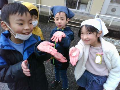 子供たちは「大きいね」「タピオカみたい」「じゃりじゃりする」と、空から降ってきた贈り物に大喜びしていました。