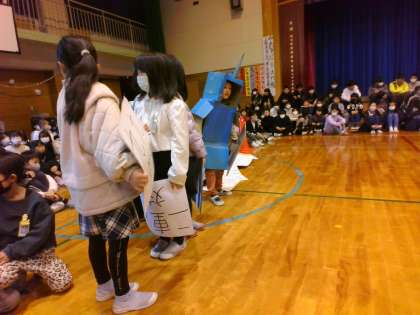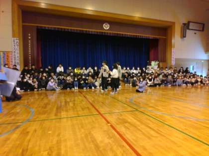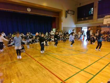 今日の3、4時間目に6年生の卒業を祝う会を行いました。2年生は6年生と九九を言う早さと20秒間の二重跳びとぐるぐるパットで対決をしました。勝ったり負けたりと好勝負となり、真剣勝負を一緒に楽しみました。