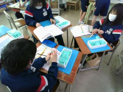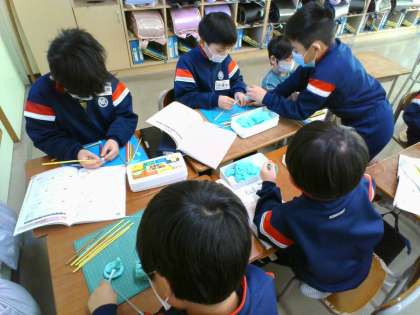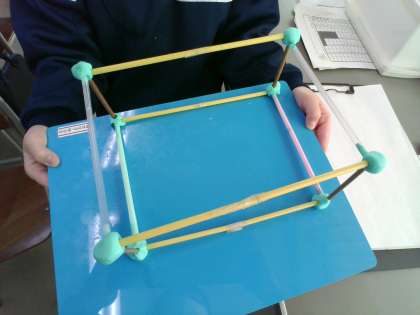 算数科「はこの形をしらべよう」の学習では、ひごと粘土を使って、直方体の形を作りました。友達に作り方を聞いたり、友達と協力したりして、直方体の形を完成させました。直方体には同じ長さの辺が4本ずつ、頂点は8つあることを調べました。