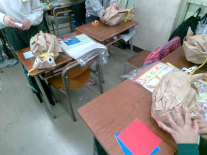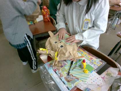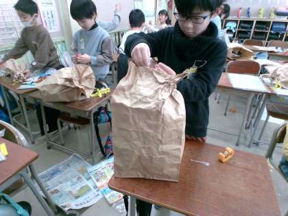 図画工作科の時間に「くしゃくしゃぎゅっ」をつくっています。紙袋に新聞紙を入れ、好きな形にし、魚やかめ、うさぎなどいろいろなものができあがっています。