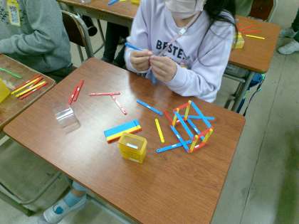 今までの学習を生かして、算数ボックスの棒を使って直方体と立方体の箱の形をつくりました。同じ長さの棒がいくついるのか考えながらつくりました。