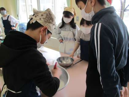 学級活動のお楽しみ会の一環でパンケーキ作りをみんなで行いました。班で協力してパンケーキを作ったり、作ったパンケーキを笑顔で食べたりと、学級の仲間との団らんの時間を楽しんでいました。