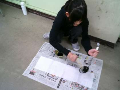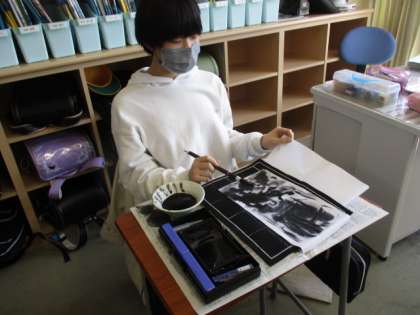 図画工作科では、水墨画に挑戦しました。筆だけではなくいろいろな道具を使ったり、水の量を変えて濃淡を工夫したりと、思い思いに表現していました。