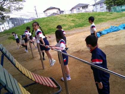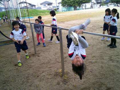 鉄棒学習では、「鉄棒苦手なんだ!」と言う子どももいましたが、「豚の丸焼きじゃんけん」や「ふとんほし」などの楽しめる技や、「逆上がり」などの難しい技まで、喜んで練習していました。