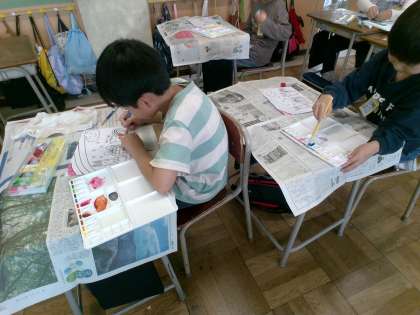 今日の図工は水彩の練習をしました。水をどのくらい入れればよいか考えながら色をつくっていました。