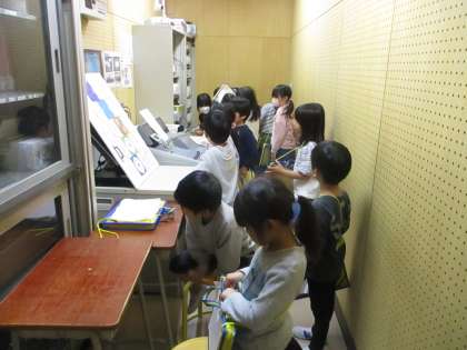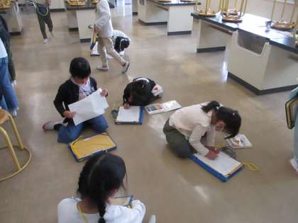 学校探検では、理科室、家庭科室、図工室、体育館などにも行きました。子供たちは、理科室と図工室の机がちがっていることに気づいたり、見たこともない実験器具に驚いたりと、新鮮な目でいろいろなものを見ているようでした。