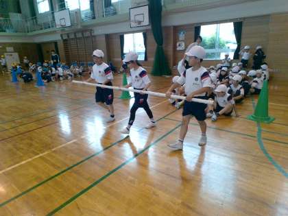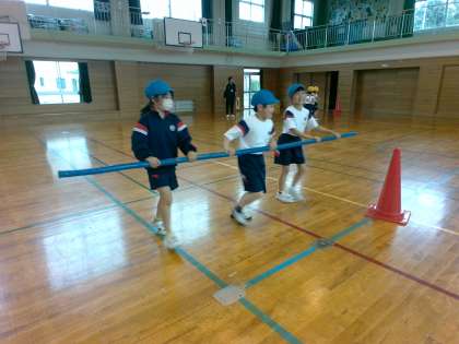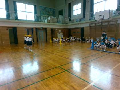 3年生はぐるぐるレースをします。今日は並び方を確認し、お試しで動き方をやってみました。3人組になり、誰がどこをもって走ったらよいか相談しました。