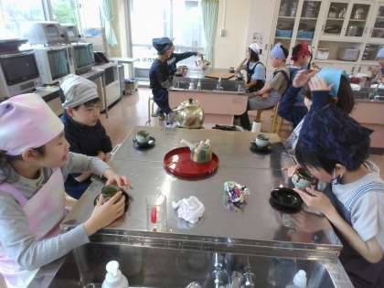 ガスコンロの使い方を学び、グループごとに協力してお茶をいれました。子供たちは、水や茶葉の分量を量ったり湯をわかしたり、みんなで役割を分担して手際よく活動していました。「おいしい」「苦い」と感想を伝え合いながらお茶をいただきました。
