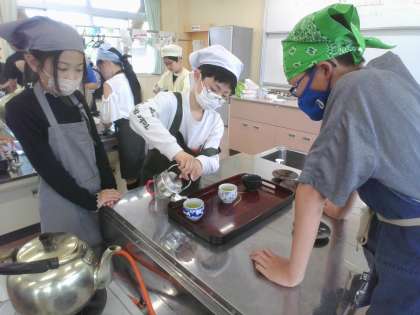 ガスコンロの使い方を学び、グループごとに協力してお茶をいれました。子供たちは、水や茶葉の分量を量ったり湯をわかしたり、みんなで役割を分担して手際よく活動していました。「おいしい」「苦い」と感想を伝え合いながらお茶をいただきました。