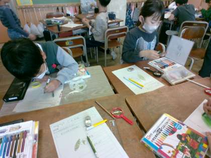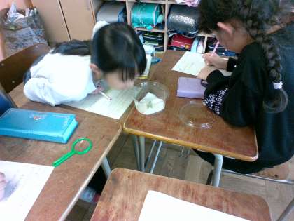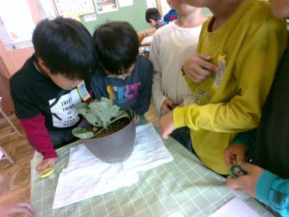 今日の理科は、モンシロチョウのたまごの観察をしました。「小さいな」「こんなに小さいたまごから生まれるなんてびっくりする」と虫めがねでよく見て観察しました。