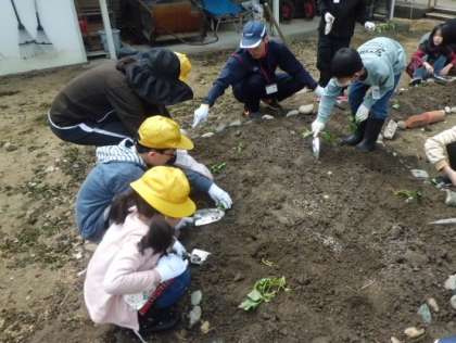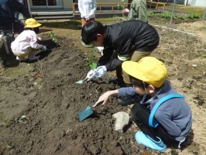 「苗は寝かせて植えるんだよ」と先生から説明を聞いたので、「これでいい?」と確認しながら植えていました。
