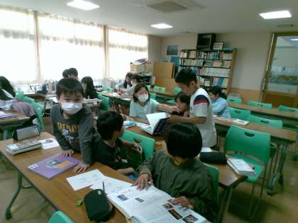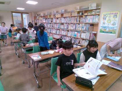 国語科の学習で百科事典の使い方を学びました。学校司書の山口先生から、百科事典の使い方を教わり、子供たちは協力しながら調べたい言葉を見つけていました。