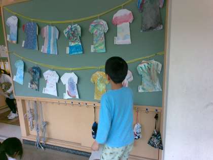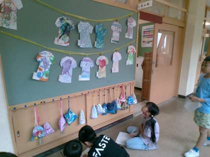 水彩で描いた模様を生かして、すてきなTシャツをつくりました。友達の作品を見合いながら色合いや模様のよさをたくさん見つけていました。