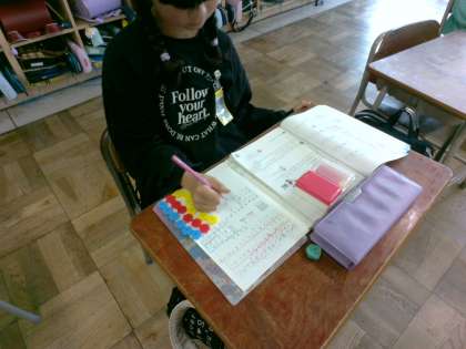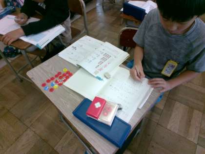 わり算の学習をしています。おはじきを使い、「同じ数ずつ分けると何人に分けることができるのか」「何人で分けるといくつもらえることになるのか」意味を考えながら答えを導き出しました。