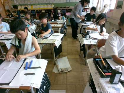 書写の時間に「二」を練習しました。書き始め、終わりの筆の向きや筆の持ち方に気を付けて書きました。