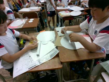 今日は図工の時間に「動いて楽しい割りピンワールド」の仕組みをつくりました。割りピンをさすとくるくる回る楽しさを知り、「観覧車をつくろうかな」「水族館で魚が飛び出すのにしようかな」とイメージを膨らませていました。