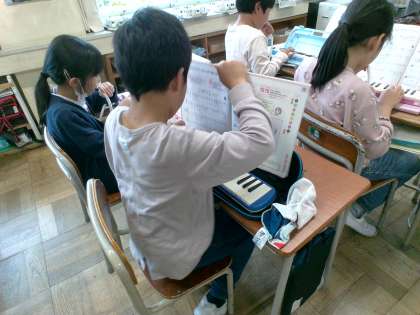 今日はリズムに気を付けて「にじ」を歌いました。また鍵盤ハーモニカの練習も行っています。指番号や吹き方に注意して練習していました。