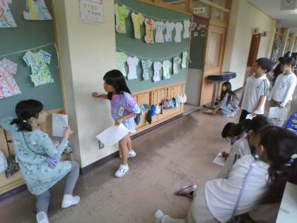 図画工作科では、絵の具と筆を使って自分がイメージした模様を描き、Tシャツ型の作品を作りました。今日はその作品を鑑賞し、友達の作品のよさをたくさん見付けました。