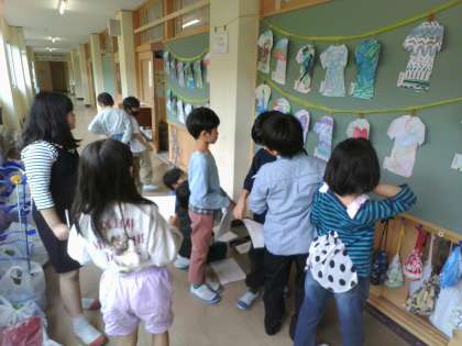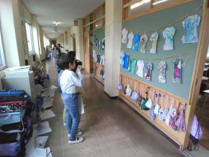 図画工作科では、絵の具と筆を使って自分がイメージした模様を描き、Tシャツ型の作品を作りました。今日はその作品を鑑賞し、友達の作品のよさをたくさん見付けました。