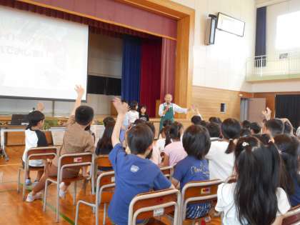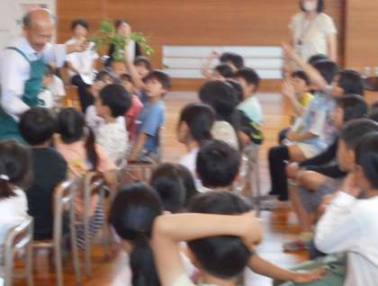 お話を聞いて、子供たちは生活科で育てている野菜の鉢をどこに置いたらよいのか考え始めていました。また、給食時間には「野菜をしっかり食べよう」と言っている子供たちがいました。