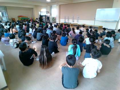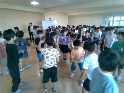 朝活動の時間に学年で集まりました。3年生になり、トライ!する時に大切な、「自主・自律・自由」についての話を聞き、みんなで考えてみました。その後、学年全員でじゃんけんゲームをしました。学級を越えて関わる楽しそうな姿が見られました。