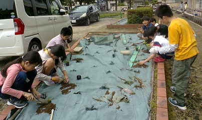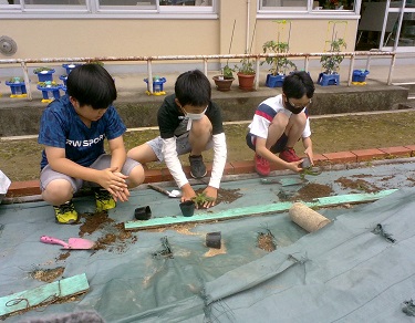 先日、飼育栽培委員会の子供たちで、花壇に花の苗を植えました。植えた苗は、サルビア、ファリナセア、センニチソウ、ニチニチソウの4種類です。