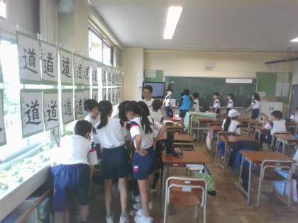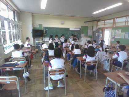 クラスのみんなに楽しんでもらおうと、朝の時間、係ごとにクイズや占いをしています。今日は漢字クイズで、「たちうお」や「コスモス」を漢字で書く問題でした。友達と相談しながら楽しく活動しました。