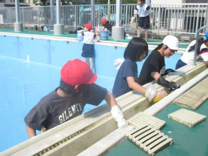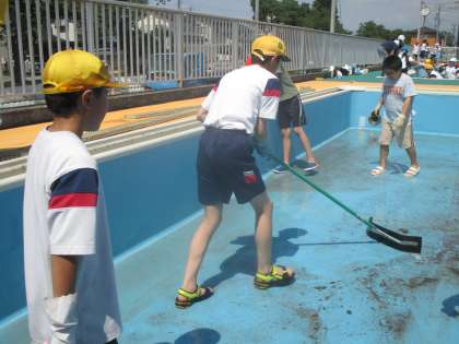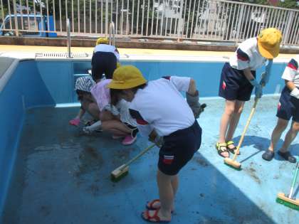 プール掃除を行いました。1年間使っていなかったプールは、汚れがひどく、足をつけるのもためらわれましたが、1時間かけてブラシやスポンジで一生懸命こすったり、バケツで水を何度も流したりし、とてもきれいになりました。みんなのために、プールをきれいにしたいと心を込めて掃除をする姿に、最高学年としてできることを考えているのだなと嬉しくなりました。