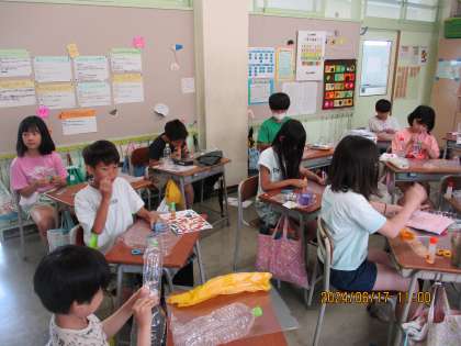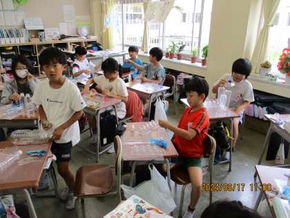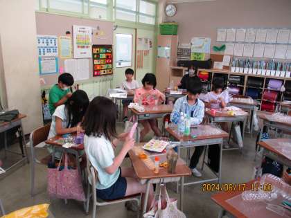 4年生の図画工作科では、クリアファイルに光を通す素材を貼り付けて、色や形を楽しみながら作品を仕上げました。
