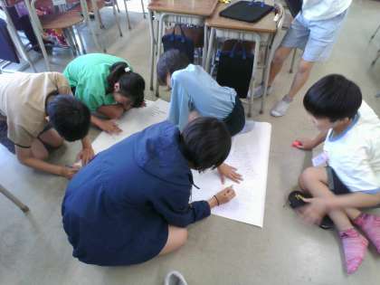 「アンケートをとって、グラフをつくろう」「わかりやすいように色をつけよう」「どんな見出しがいいかな」と班で協力して、見て分かりやすい新聞づくりに努めました。
