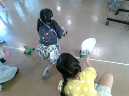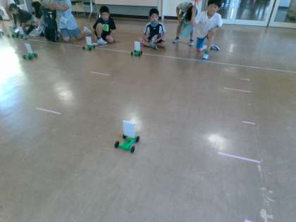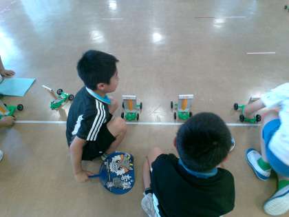今日は理科の時間に風の力で動く車のレースをしました。どうしたらもっと遠くまで進むのか、風の量や当て方を考えながら楽しんで活動していました。