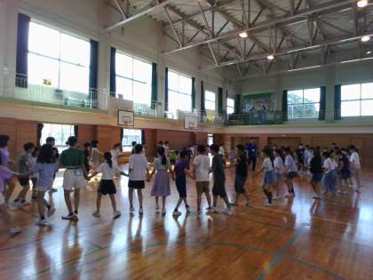 明日の宿泊学習に向けて、キャンプファイヤーの歌や踊りの練習をしました。