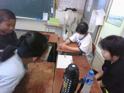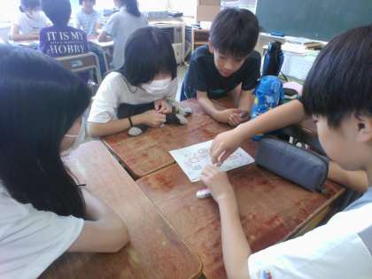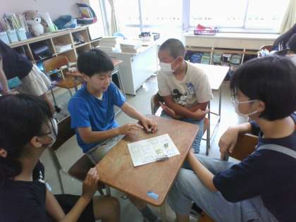 朝の活動で、係が企画したすごろくをみんなで楽しんでいます。