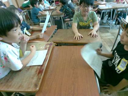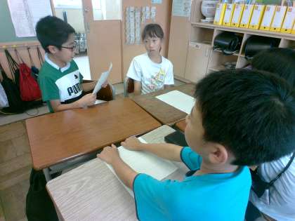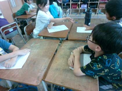 国語科では、「本で知ったことをクイズにしよう」という学習をしています。いろいろな本に親しみ、図鑑や科学読物などから自分が「おもしろい」「初めて知った」と思うことをクイズにしました。今日は考えたクイズを友だちに出し合って、クイズ大会をして楽しみました。