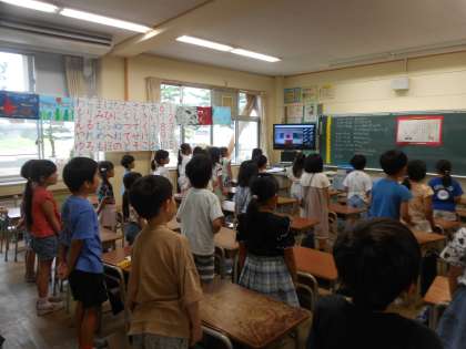 暑さ対策の為、各教室で行いました。校長先生の話の資料として、18歳時に自分が大人と感じる国別割合のグラフが提示されました。オンラインだったので、グラフが見やすく、子供たちも「日本の数字って低いんだ」など、感じるところがあったようです。