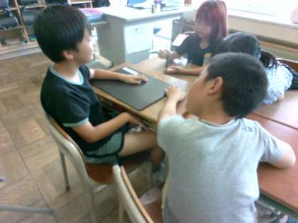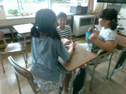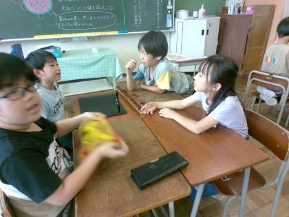 4組の学級活動では、夏休みの思い出をクイズにして出し合いました。「こんなおいしいものを食べたよ」「ぼくの行った楽しい場所はどこでしょう」とみんな楽しそうに話し合っていました。