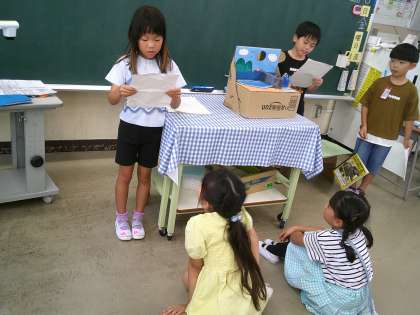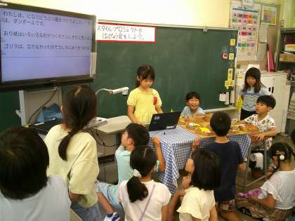 夏休みに頑張って挑戦した「フリースタイルプロジェクト」の発表会を行いました。一度まとめたことを、クロームブックのスライドを使って説明したり、原稿を読んだり、実際にみんなの前で披露したりしました。友達の挑戦やまとめ方のよさを感じていました。