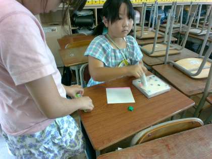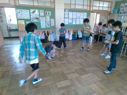 休み時間はいろいろなことをして遊んでいます。教室ではこまをしたり折り紙をしたりして楽しんでいる子供たちがいます。