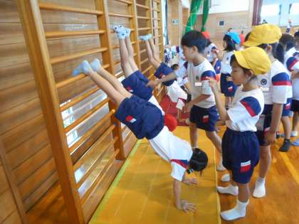 ろくぼくコースでは、かべのぼりさか立ちに挑戦し、友達が「何本目まで上がれたよ」と数えていました。「前回より高くのぼれたよ」と嬉しそうな子供たちが多くいました。