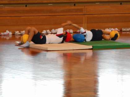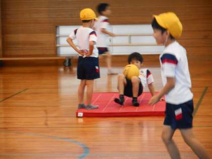この他にも、友達と並んでタイミングを合わせ、一緒に前ころがりをしていたり、マットを坂道にして後ろころがりを練習したりするなど、場を工夫していました。