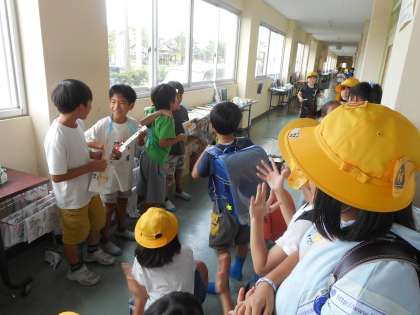 「ゴムがぶんぶん鳴るから、ハチみたいなので、花畑にハチが飛んでいるデザインにしたよ」と音と結びつけて作っている子供もいました。