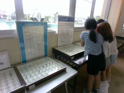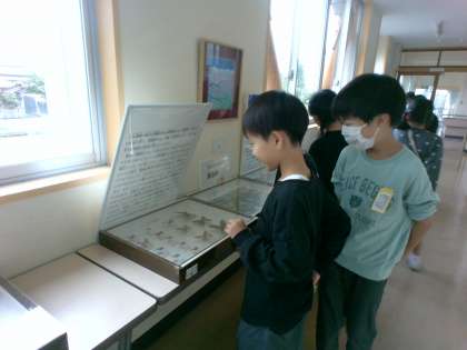 科学博物館から昆虫の標本をたくさんお借りしています。理科では昆虫のからだのつくり等について学習しました。「どの昆虫も足が6本ついているね」「モンシロチョウとアゲハチョウしか知らなかったけど、こんなにきれいな羽のチョウがたくさんいるのだね」と、富山に住む様々な昆虫に興味をもち見ている子供たちがたくさんいました。