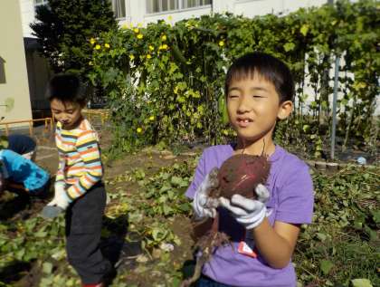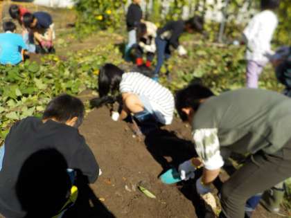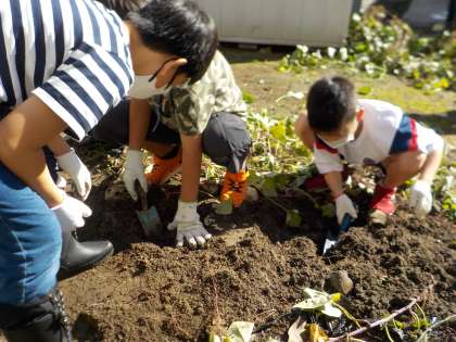 5月に植えたさつまいもの収穫を行いました。「どれくらい大きくなったかな」「ここに根っこが見えるから掘ってみようよ」と子供同士で声をかけ合う姿が見られました。興味関心をもち、学年問わず仲良く活動することができました。
