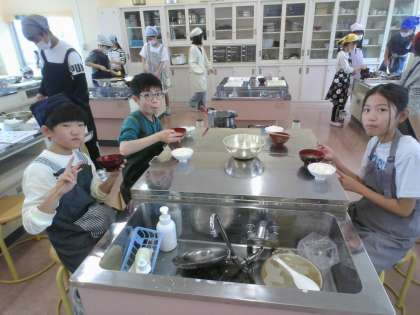 家庭科の学習で調理実習をしました。ご飯とみそ汁を作りました。グループの人と協力しながら作業を進めることができました。