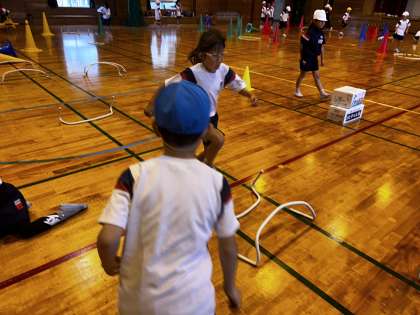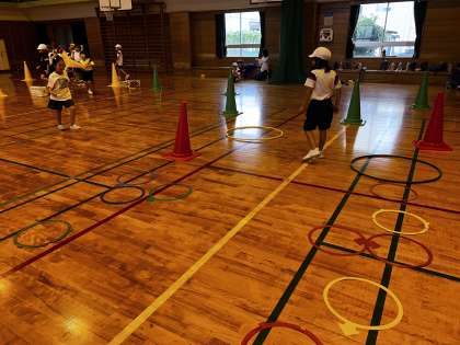 体育科では、かけっこに取り組み、走る・跳ぶの運動から子供が走り方やスタートの仕方、競走、コースの工夫を自ら考えてオリジナルコースを作っています。「難しいコースを作りたいからここに段ボールを置こうよ」「こんな感じで走ったらいいよ」などと友達と関わり合う中で「かけっこを楽しむ」を目標に学習しています。