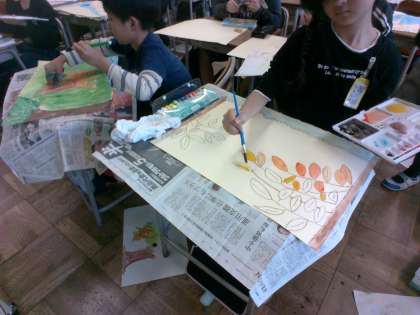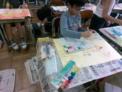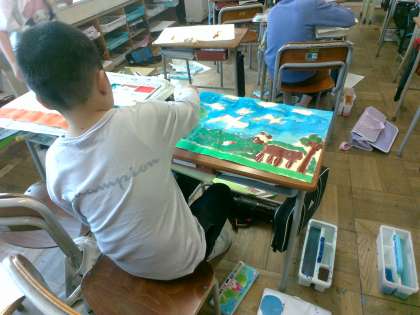 図工の時間には、お話の絵を描いています。図書室の本の中から自分が選んだお話の好きな場面を絵にしています。クレヨンで周りの線を描き、水彩で色をつけているところです。できあがりが楽しみです。