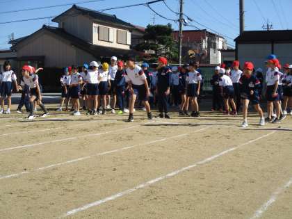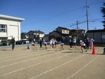 秋空の下、50m走記録会を行いました。子供たちは、自分の記録を伸ばそうと全力で走っていました。