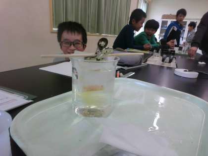 理科「もののとけ方」の学習をしています。砂糖や塩などを水に溶かし、その様子を観察しました。
